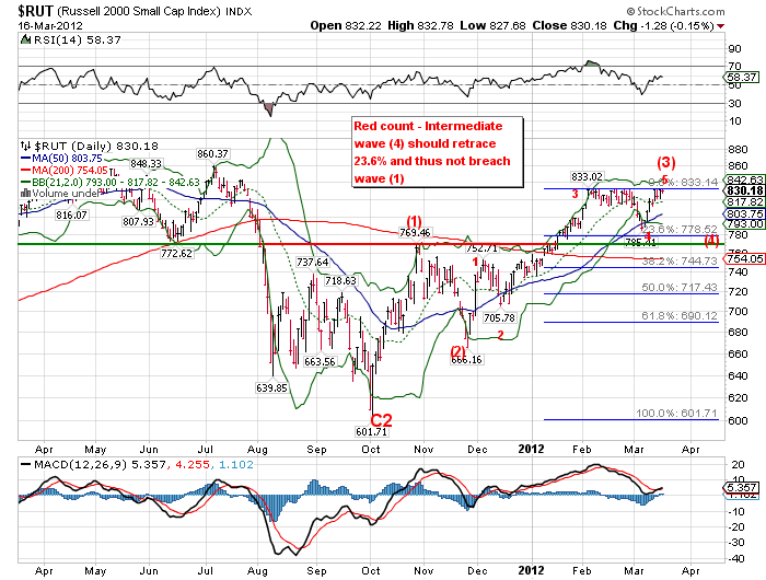 However, for a variety of reasons, which include the EW counts I’m going to share today, I believe the markets are about to take a much needed breath after quite sprint to these lofty heights. The micro count could have room for a tiny push up on Monday, or it could have concluded on Friday; but, for the SPX specifically early this week we should see the pullback to 1340 (cash) begin. Below are charts for the SPX and RUT