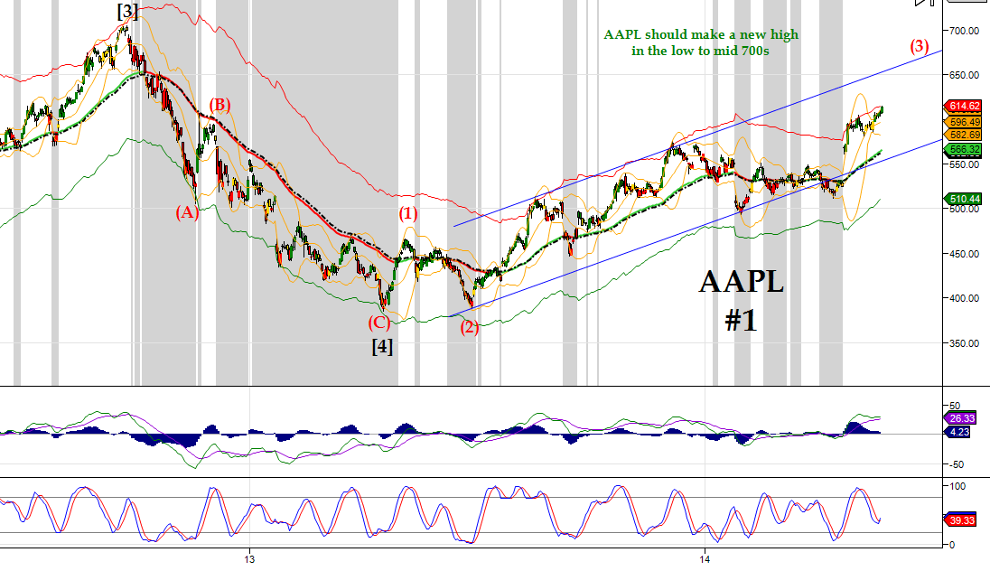 AAPL (Since I own AAPL, I’ll give you my price target – I’m looking for a new high for AAPL in the low to mid $700s):