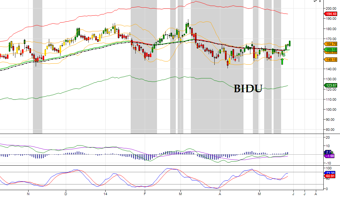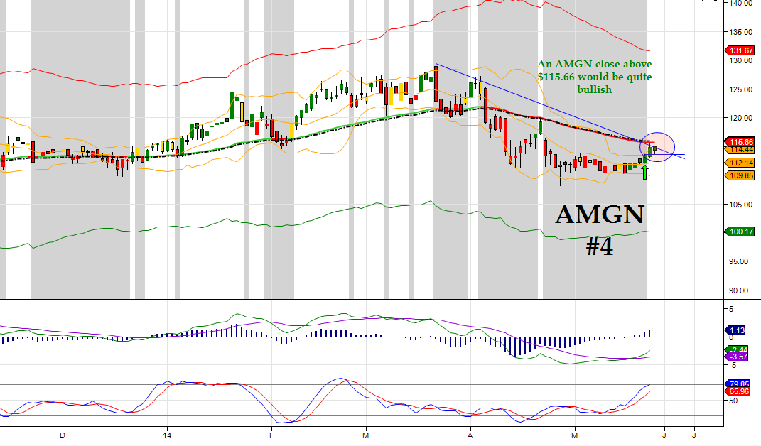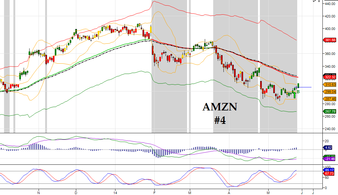 I personally only own AAPL and have owned it for several months, but might look to add one or more of these names, but then again I might not. I am of course long the Nasdaq via QLD and the RUSSELL via TNA. So here’s a quick look at AAPL #1 weighted Nasdaq stock, GOOGL #3, AMZN #4, AMGN #10, and BIDU (not sure where it’s ranked). Obviously, this is only a selective group of names albeit some of the heaviest weighted in the index, but in my eyes they tell a similar bullish story as the Nasdaq index. Here’s what I’m seeing, several have either just signaled BUY/LONGs, and the stops placement should be obvious: